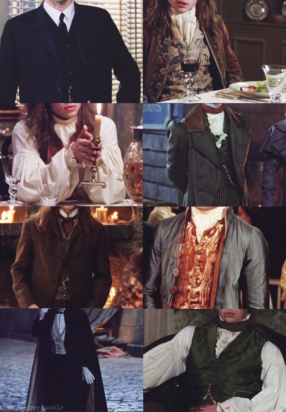 January 10, 2014 iwantmyiwtv blue-et-grey: Interview With The Vampire + outfits Louis de Pointe du Lac #//can’t ever handle those bottom two Ditto. Share this: Click to share on X (Opens in new window) X Click to share on Facebook (Opens in new window) Facebook Like Loading... Related