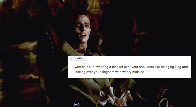 August 14, 2015 iwantmyiwtv princething: winter looks: wearing a blanket over your shoulders like an aging king and looking over your kingdom with weary malaise Share this: Click to share on X (Opens in new window) X Click to share on Facebook (Opens in new window) Facebook Like Loading... Related