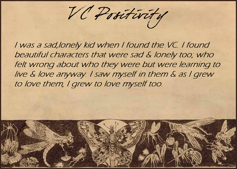 “I was a sad,lonely kid when I found the VC. I found beautiful characters that were sad & lonely too; who felt wrong about who they were but were learning to live & love anyway. I saw myself in them & as I grew to love them, I grew to love myself too.”