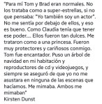 “To me Tom and Brad were normal. I didn’t treated them like super stars, but I thought:” I’m an actor too". I didn’t feel inferior to them and that was good. As Claudia I had to have that power… They were so sweet. They treated me like a Princess. They were super protective and nice with me. Tom was lovely. He put a Christmas tree in my bedroom and CD players and video games, and he always made sure that I wasn’t scared in every scene we filmed. He spoiled me. They both did.“