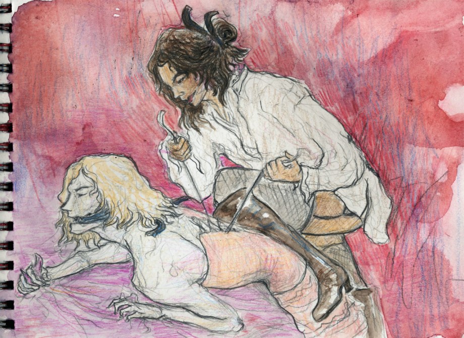 Sometime last autumn I read a post where one of the Lestat role-players of the site answered a question/prompt about crossdressing with L’s fond reminiscence of a lady with whom they sometimes swapped clothes. So I sketched this on my 14 min morning train to school. Found the sketch yesterday and finished it, but now can’t find the original post or remember who was the writer. Anyway Lestat enjoying a corset (and yes that corset has a weird double lacing or smth)