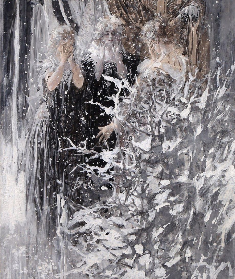 “Victorian winter scene for publication in Century magazine. The image shows three demure maidens delighting in the gentle fall of snowflakes in an unexpected Christmas blizzard.” (1899)